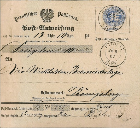 zweite Postanweisung aus Pillau nach Königberg über 13 Taler und 10