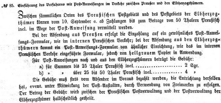 Nach der Besetzung von Schleswig-Holstein durch Preußen und Österreich wurde durch die Generalverfügung Nr. 85 (veröffentlicht im Amtsblatt des Königlichen Post-Departements Nr. 40 im Jahr 1865 [18]) auch für Geldsendungen von und nach den Elbherzogstümern das Postanweisungsverfahren gestattet. Im Vergleich zu dem innerpreußischen Verfahren gab es einige Unterschiede. Zum einen wurde eine deutlich höhere Gebühr (2 bzw. 4 Silbergroschen anstatt 1 bzw. 2 Silbergroschen) verlangt. Außerdem war ein auf ein andersfarbiges Papier gedrucktes, ansonsten aber gleiches Formular für Postanweisungen aus den Elbherzogstümern zu verwenden. Der möglicherweise in Schilling-Währung zu versendende Betrag war daher in preußische Währung umzurechnen. Bislang sind keine Postanweisungen, die diese Verfügung belegen, bekannt.