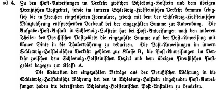 Nach der vollständigen Besetzung Schleswig-Holsteins durch Preußen 1866 und der Übernahme des Postwesens durch die preußische Post zum 1.Januar 1867 veränderte sich auch das Postanwei-sungsverfahren. Beschrieben sind die Veränderungen in der Generalverfügung Nr. 140 (veröffent-licht im Amtsblatt des Königlichen Post-Departements Nr. 51 im Jahr 1866 [19]).