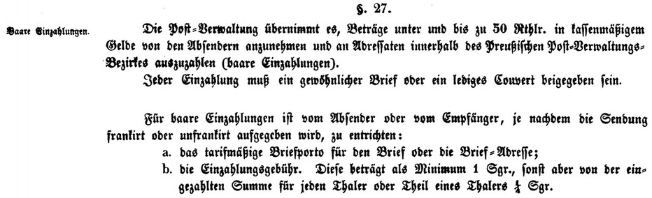 Mit der Verordnung Nr. 265 aus dem Amtsblatt des Königlichen Postdepartements Nr. 50 aus dem 1848 [1] wurde ab dem 1.Dezember 1848 die Möglichkeit für die Postkunden eröffnet, Beträge bis zu 25 Taler auf aufgegebene Briefe einzuzahlen. Diese Beträge wurden dann an den Empfänger wieder ausgezahlt. Die Gebühr für die eingezahlten Beträge betrug für jeden Taler (bzw. einen Teil von diesem) ½ Silbergroschen neben der normalen Briefgebühr unabhängig von der Entfernung. Die Verordnung Nr. 265 enthielt neben den Bestimmungen zur Annahme und der Spedition der Briefe mit Bareinzahlungen auch besondere Anweisungen, wie der Geldbetrag an den Empfänger auszuzahlen war.